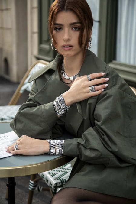 Il en va de même pour les bracelets, pensés pour se combiner entre eux. Certains sont lisses, d'autres sertis de pierres scintillantes ou colorées : les alterner au poignet permet de créer un rythme, d'apporter une touche plus lumineuse ou plus sobre selon l'envie. Un jeu d'accumulation simple, qui laisse à chacun la liberté de composer son look, sans règles imposées.
