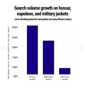 Selon le data analyste @style.analytics, ladite veste a ainsi enregistré une hausse de ses recherches de 300%, 225% et 80% le mois passé, sous ses différentes appellations. Cette veste qui fait un retour fanfaronnant dans le monde des fashion n'est autre que la "veste hussard", aussi appelée "veste officier" ou "veste Napoléon".