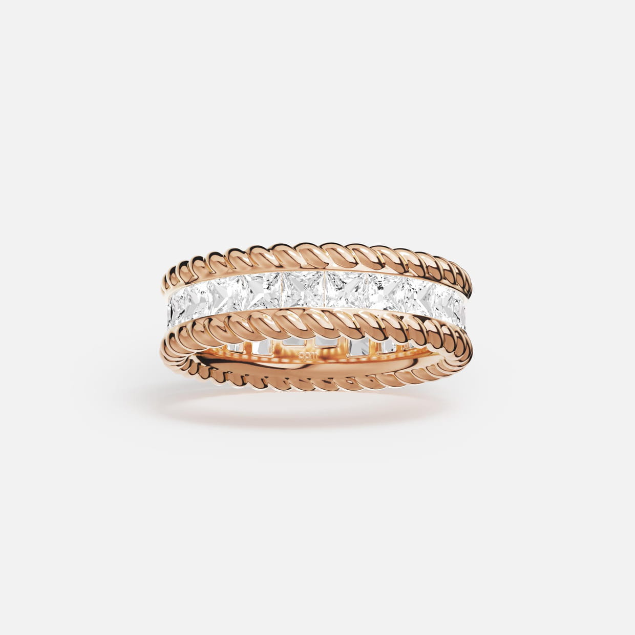 Une bague en trois anneaux superposés qui marie l'or rose torsadé et une ligne centrale pavée de pierres, pour un effet empilé élégant.