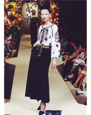 La Russie a toujours inspiré le créateur. Cette blouse blanche brodée de motifs noirs, gainée par cette ceinture à cordons, évoque les costumes traditionnels de ce pays.