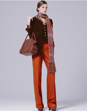 Veste et gilet en velours marron, pantalon en twill de laine feutrée couleur rouille, écharpe orange et grise... La collection a beau arriver en plein mois de juin en boutique, elle revêt clairement des couleurs d'automne. Outre les bottines compensées en cuir brodé marron très seventies, les fashionisats auront déjà jeté leur dévolu sur ce sac "East West Totem" en crocodile marron. Attention, it-bag en vue !