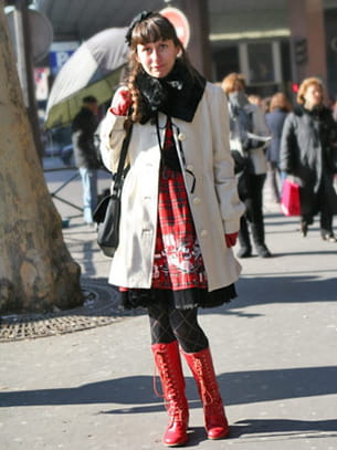 On aime : le parti pris assumé du look manga parisien sans être aussi extrême que celui de nos amies japonaises. Les tresses et le petit noeud dans les cheveux s'accordent parfaitement avec la tenue tandis que les bottes à lacets rouges apportent une touche véritablement sexy.