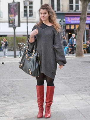 On aime : la féminité et la sensualité de son look. Cela vient de l'association de la robe ample au col large et tombant négligemment sur les épaules avec les bottes rouges montantes.