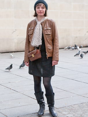 Son look : une veste en cuir et un pull Kookaï, une jupe Version originale, un béret H&M et un sac vintage.