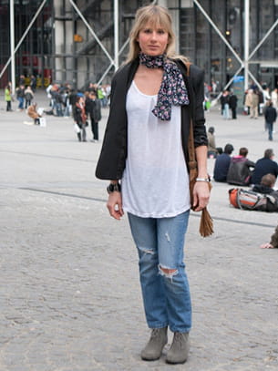 On aime : le joli foulard au motif fleuri noué sur le côté qui tranche élégamment avec le jean troué. Ce mélange d'éléments grunge et féminins est dosé avec subtilité pour un résultat à la fois sensuel et cool.