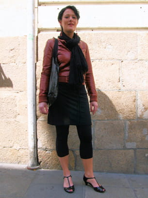Son look : un blouson court H&M, une robe noire et des leggings de La City, des chaussures toutes en plastique trouvées dans une friperie.