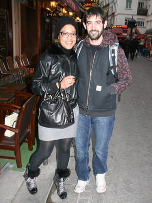 Elle : veste en cuir noir et col fourré assortie aux chaussures montantes noires et fourrées, bonnet noir et maxi lunettes.