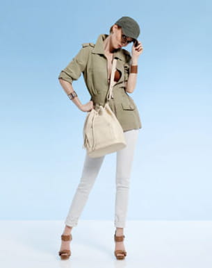 Voilà un look décontracté qui se dote de détails chics, pour rester tendance en toutes occasions ! Un slim blanc, une veste kaki et la casquette ton sur ton, on est bien dans l'esprit camouflage de la tenue militaire. Cependant, on reste fashion avec le slim qui se retrousse sur des sandales en cuir marron avec une bride autour de la cheville. Et pour le côté girly, les poignets se décorent de bracelets manchettes plaqués argent et en cuir.