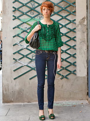 On aime : le rappel de couleur entre le chemisier et les chaussures et le contraste avec les cheveux roux de notre modèle.