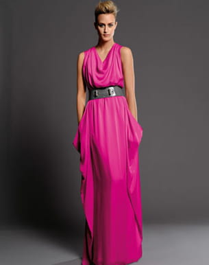 La robe se fait longue et colorée à la rentrée. Le rose fuchsia s'affirme et donne toute son ampleur à cette robe drapée. Légère et très glamour, elle s'impose pour les soirées et se porte ceinturée. Un modèle pour voir la vie en rose.