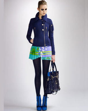 Pour apporter un peu d'exotisme à la rentrée, la mini jupe se pare d'un imprimé à l'esprit asitiaque. Colorée et asymétrique, elle s'oppose en contraste au blouson bleu, réinterprétation du Perfecto. Un mélange des styles audacieux qui fonctionne un merveille.