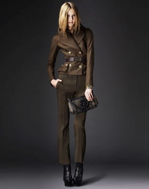 Le style militaire se met au garde-à-vous cet automne. La veste officier ceinturée se pare évidemment de tons kaki. Le pantalon droit affiche un pli au carré mais se porte raccourci. Le tout dessine une nouvelle allure pour le tailleur-pantalon qu'on féminise avec une jolie pochette.