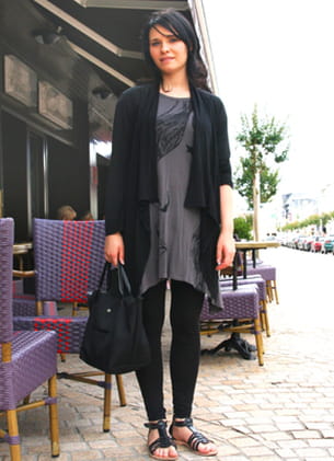 Son look : la tunique et le gilet long de chez Promod. Le legging de la Redoute, les spartiates de la marque Texto et le sac Longchamp.