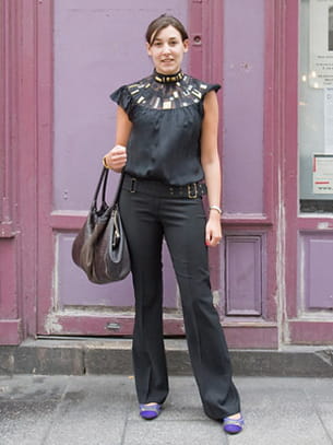 On aime : la forme de la blouse qui met en valeur le port de tête et les épaules. Elle reste très chic avec un pantalon noir classique. Quant à la petite note de couleur, elle se retrouve en toute simplicité dans une paire de ballerines acidulée.