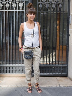 Son look : un pantalon carrot, un débardeur H&M, le tout rehaussé d'un petit sac, de spartiates et d' accessoires New Look.