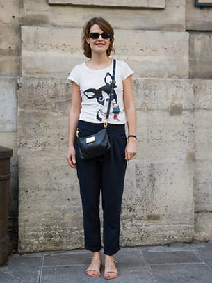 Son look : des lunettes Armani, un tee-shirt H&M, un pantalon Scarlet Roos, un sac Marc by Marc Jacobs et des sandales Bata.