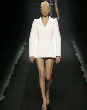 Voilà 20 ans que Martin Margiela fait figure de créateur à part dans le milieu de la mode. Créativité exacerbée, collections qui font figure d'ovni... Ce défilé n'a pas dérogé à la règle. Le visage recouvert d'une sorte de bas couleur chair, les mannequins ont défilés vêtues d'un manteau dont la fourrure a été remplacée par des perruques, d'une veste géante à paillettes ou d'incroyables robes au col ultra sophistiqué. Le moment le plus surréaliste de la fashion week parisienne !