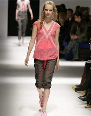 L'heure est à la décontraction et à la fraîcheur chez Marithé & François Girbaud. Poches, zips, lacets, chaînes sont là pour rappeler la fusion entre l'accessoire et le vêtement. Le lacet, qui souligne les robes, jupes, pantalons et chaussures, est le fil conducteur de la collection. Les couleurs dominées par un bleu clair unique s'accordent aux tonalités poudrées de beige et de gris, soulignées par des bandes de couleurs aux connotations sportives. Le blanc optique illumine cette gamme de couleurs douces. Les matières, coton avec etsoie, polyester et élasthane; sont équilibrées. Le tissu se croise et s'entrecroise pour s'équilibrer avec harmonie et sensualité au travers d'une transparence maîtrisée qui donne aux jupes et aux robes un vent de légèreté.