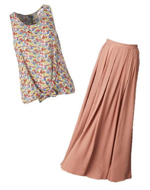 Pour une allure bobo chic, on craque pour une jupe très longue. Avec son délicat coloris rose poudré, elle ne manquera pas de faire craquer les modeuses. Elle se marie à merveille avec ce petit top en créant un rappel avec l'imprimé floral. Et pour jouer le total look, on mise sur des espadrilles compensées ou des sandales esprit sabot, un sac en cuir façon vintage et pourquoi pas, une grande capeline !