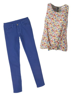 Comment réunir les deux tendances dominantes de la saison ? En associant ce top à l'imprimé floral à un pantalon bleu très color block ! Un exercice de style réussi et très mode qui assurera allure et confort. En effet, rien de plus pratique qu'un jean qui pourra nous suivre aussi bien dans nos virées shopping qu'au bureau !