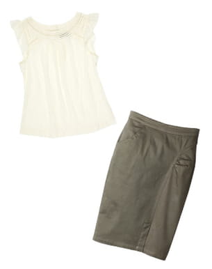 Pour aller au bureau ou à une soirée, on mise sur un duo simple et efficace. Le top immaculé se verra facilement associé à une jolie jupe droite à l'esprit très working girl. On mise sur du kaki pour donner une touche "baroudeuse" à l'ensemble. Et voilà, une tenue simple et efficace que de nombreuses femmes vont adopter sans hésiter !