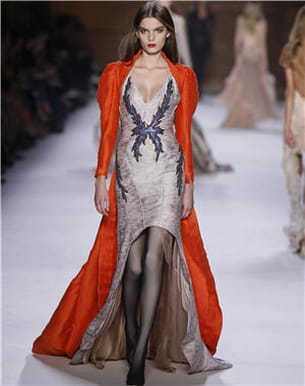 Le directeur artistique de la maison Nina Ricci, Olivier Theyskens, revisite et modernise une mode d'antan, faite de corsets, de cols hauts et de manches longues épaulées. Cette collection printemps-été se situe à mi-chemin entre de la lingerie vintage et un prêt-à-porter ultra chic composé de plusieurs robes longues à traîne. Les gazes, résilles de coton et autres délicates étoffes se déclinent dans des teintes poudrées réhaussées de couleurs vives comme le rouge carmin.