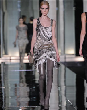 On est loin des fastes et des ors auxquels la maison nous avait habitués ces dernières saison. Le duo Eva et Roberto Cavalli proposent en effet une collection dans des tonalités sombres de gris, de noir et de beige. A noter qu'avec les robes comme les jupes, la femme Cavalli portera des cuissardes en cuir stretch, ultra glamour.