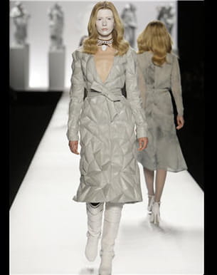 D'un pas lent, des mannequins maquillés de blanc défilent dans un calme et une sérénité absolus. Sur leur corps, des trenchs ceinturés, des jupes et des robes à effet 3D, le tout décliné en beige, marron, gris... A noter également des robes à imprimés kaléïdoscopiques, qui closent le show, mais toujours dans des couleurs hivernales. Un joli moment de recueillement.