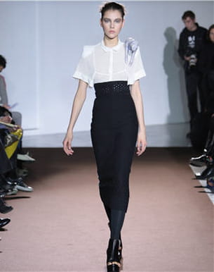 Une coupe irréprochable, des tonalités sobres... Cette saison, Véronique Leroy fait dans le classique. On aime ses jupes longues portées sur des chemisiers blancs, ses robes à col roulé d'un joli bleu pastel... Mais la fantaisie est bel et bien présente, dans un surprenant chien-bijou niché sur les épaules ou aux poignets de ses mannequins.