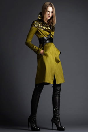 Qui dit arrivée de l'automne, dit aussi retour du manteau ! Burberry nous offre un modèle au vert bronze qui joue la carte du chic avec sa ligne ceintrée. Les détails précieux se multiplient entre le haut doré et la ceinture en cuir qui vient se nouer autour de la taille dans un style kimono. Et pour un esprit très "Chapeau melon et bottes de cuir", les cuissardes à talon aiguille sont de mise.