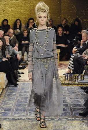 Pour changer des trop classiques noir ou marron, pourquoi ne pas miser sur un gris qui tend vers l'argenté ? C'est ce que fait la maison Chanel avec cette tenue aérienne et d'inspiration byzantine. La ceinture et l'effet bracelets qui orne les manchent rendent cet ensemble très précieux. Il en résulte une allure de déesse antique très chic !
