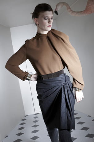 Chez Lanvin, place au drapé subtil. La blouse et la jupe jouent les asymétries contrôlées pour un résultat très couture. Le mélange des coloris beige et anthracite donnent le ton de l'automne. Enfin, la ceinture noeud s'impose comme le détail chic d'une tenue à la sophistication incontestable.