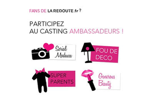 La Redoute cherche ses nouveaux ambassadeurs. Et si c'était vous ? En effet, le concours organisé par la marque se déroulera au sein de la communauté de ses 2 millions de fans sur Internet, tous sites confondus (Fanpages La Redoute, Plus Size Plus Mode, C'est Maman qui décide, Tous les Bons Plans de La Redoute et AM.PM). On peut participer en solo ou en duo. Quatre personnes seront sélectionnées pour représenter les quatre catégories dans lesquelles la Redoute s'illustre depuis plus de 80 ans. Pour participer à cette aventure, les participants devront se singulariser et donner à leur marque favorite une image originale et proche des consommateurs.