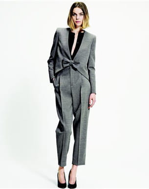 Un gros noeud ornemental sur la veste sans revers, un pantalon taille haute longueur cheville, une veste : chez Chloé, le costume se féminise. Porté sur un top noir tout simple et de basiques escarpins : c'est une merveille !