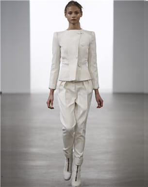 Cet automne, sera blanc. Ainsi en a décidé la maison Calvin Klein, qui propose un ravissant ensemble constitué d'une veste cintrée et épaulée et d'un pantalon carotte.
