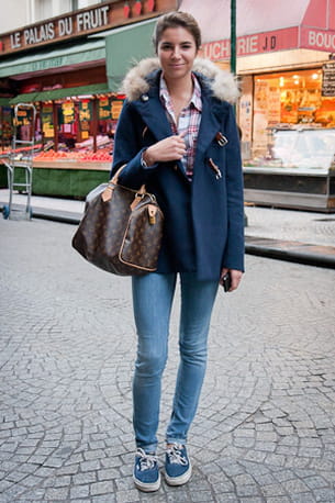 Son look : un chemisier et un jean H&M, une veste duffle-coat achetée chez Colette, un sac Louis Vuitton et des baskets Vans.