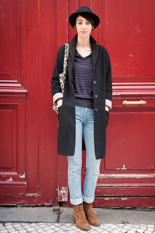 On aime : le style naturel et sans chichi de la tenue. A la fois chic par les talons et le chapeau, elle prend un côté lunaire et artiste avec le manteau à la coupe masculine.
