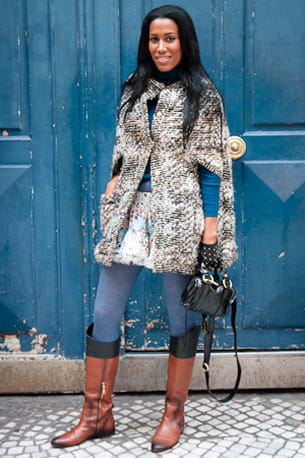 Son look : une cape Zara, un sac et des gants Yves Saint Laurent, un pull Uniqlo, une jupe Bebe, des collants H&M, des bottes Hermès.