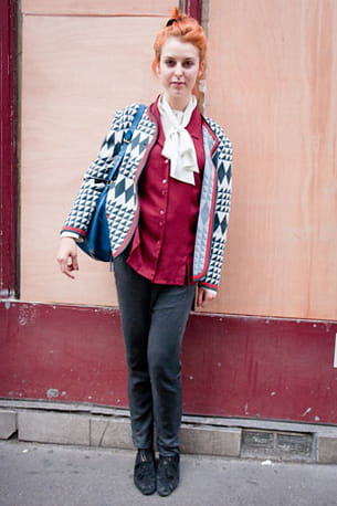 On aime : le choix du foulard blanc noué autour du coup et associé à la veste très BCBG qui fait le lien avec la chemise bordeaux. Couleurs et style se répondent pour un parfait accord vintage.