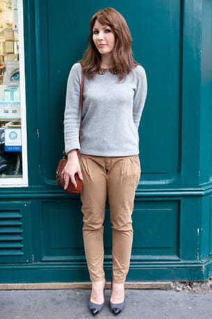 Son look : un pull Sandro, un pantalon Zara, un sac Massimo Dutti et des escarpins The Kooples.