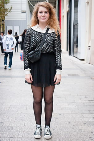On aime : le mélange des genres avec la mini jupe à volants et les collants transparents noirs pour le côté sexy et les baskets pour le côté décontracté.