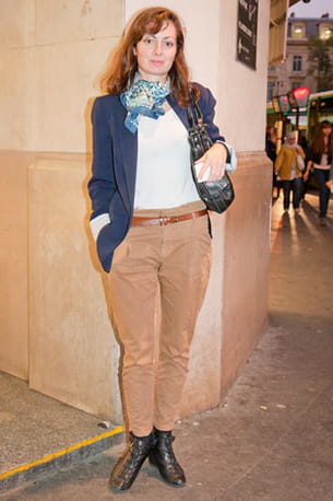 Son look : un pantalon carotte Zara, des bottines Jonak et un sac Lancaster.