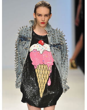 Une robe en strass avec une appétissante glace, associée à une veste en jean clouté, il fallait oser !