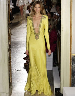 Loin de ses habituels imprimés, Pucci propose cette sublime robe du soir d'un jaune étincelant. On aime le travail de son décolleté qui forme comme un précieux médaillon au niveau du nombril.