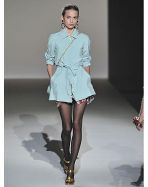 Bleu ciel, le trench de Moschino ne faillit pas à l'ambiance aquatique des podiums de la fashion week milanaise. Métamorphosée en pièce ingénue, la veste se porte courte et ceinturée, au dessus d'une petite robe fleurie et accompagnée d'une paire de sandales flashy. Les petit plus pour s'accorder avec les temps estivaux : on remonte nos manche jusqu'aux coudes et on se pare d'un mini sac assorti à nos souliers.