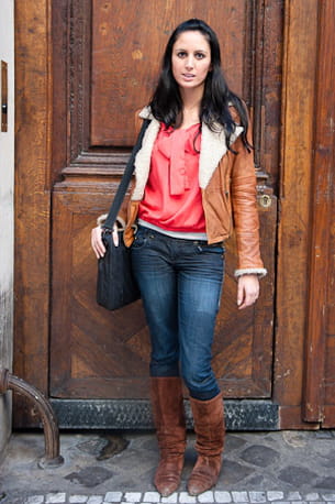 On aime : le côté hivernal venu des bottes en daim et de la veste en mouton retourné, très en vigue cette saison, ravivé par un élégant chemisier à jabot corail.