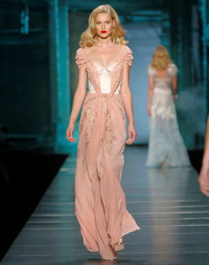 John Galliano revisite ici les codes la lingerie et propose un robe couleur chair digne des années 50 ! Ponctuée de quelques notes satinées, cette création offre ici un effet vaporeux pour un tombé des plus majestueux.