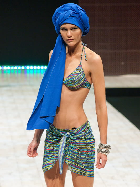 Bikini Limonada à rayures multicolores et imprimé floral en noir. Porté avec le paréo assorti.