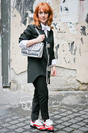 Son look : une veste Yohji Yamamoto, un sac Chanel, des chaussures Walter Steiger, un chemise et un noœud papillon Lanvin.