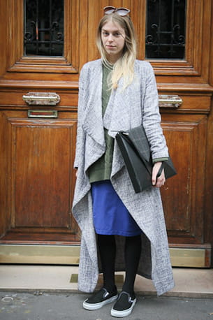 Son look : un manteau, une jupe et un sac Rodebjer, un pull emprunté à son petit ami et des Vans.